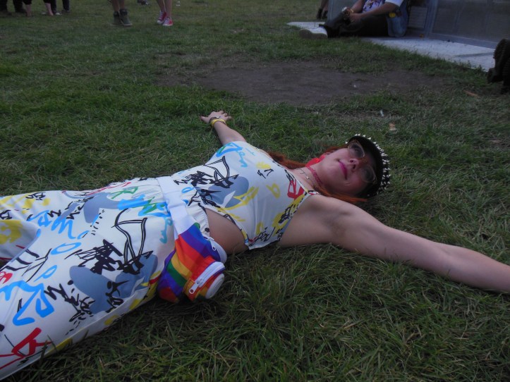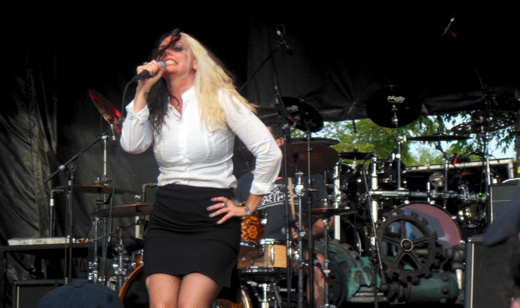 Riot Stage’s first standout was Australian minx Aviva, who kept rapt attention whether she was shaking her hips or using her microphone chord to mime a noose. Her stage presence evoked a black widow spider or a venomous asp, seductive with dark unknowable motives. Yet, there were times she seemed blissfully unaware of the crowd, lost in her own smoky world. *Adorable as she is threatening, Aviva is definitely a star to watch out for on all the music magazine covers.* Standout tracks “Dead2me” and “Grrrls” should be added to every goth night playlist, immediately.