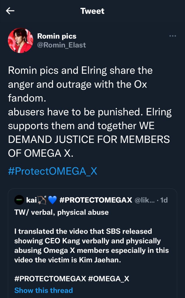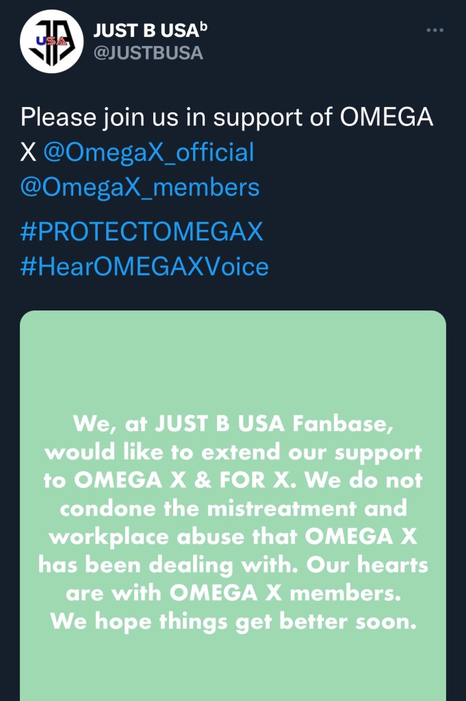 Shortly after the news about Omega X broke, that’s exactly what happened. Fandoms from groups including Ateez, Kingdom, Black Level, EXO, E’Last, Just B, Ikon, BTS and Stray Kids, among others, came together to promote the hashtag #PROTECTOMEGAX on Twitter.