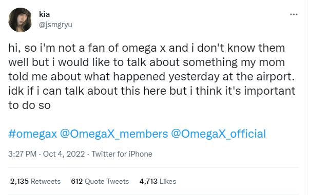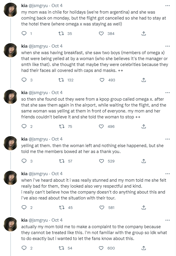 The identity of the person mistreating the group was recently confirmed to be a woman named Kang, the CEO of Spire Entertainment. This was further corroborated by statements made by Kang and Spire Entertainment. Later, For X, Omega X fans, and non-fans alike came out with other stories alleging mistreatment. One incident was originally posted to Twitter October 4 by user @jsmgryu, who alleged their mother had a similar encounter with the group in an airport.